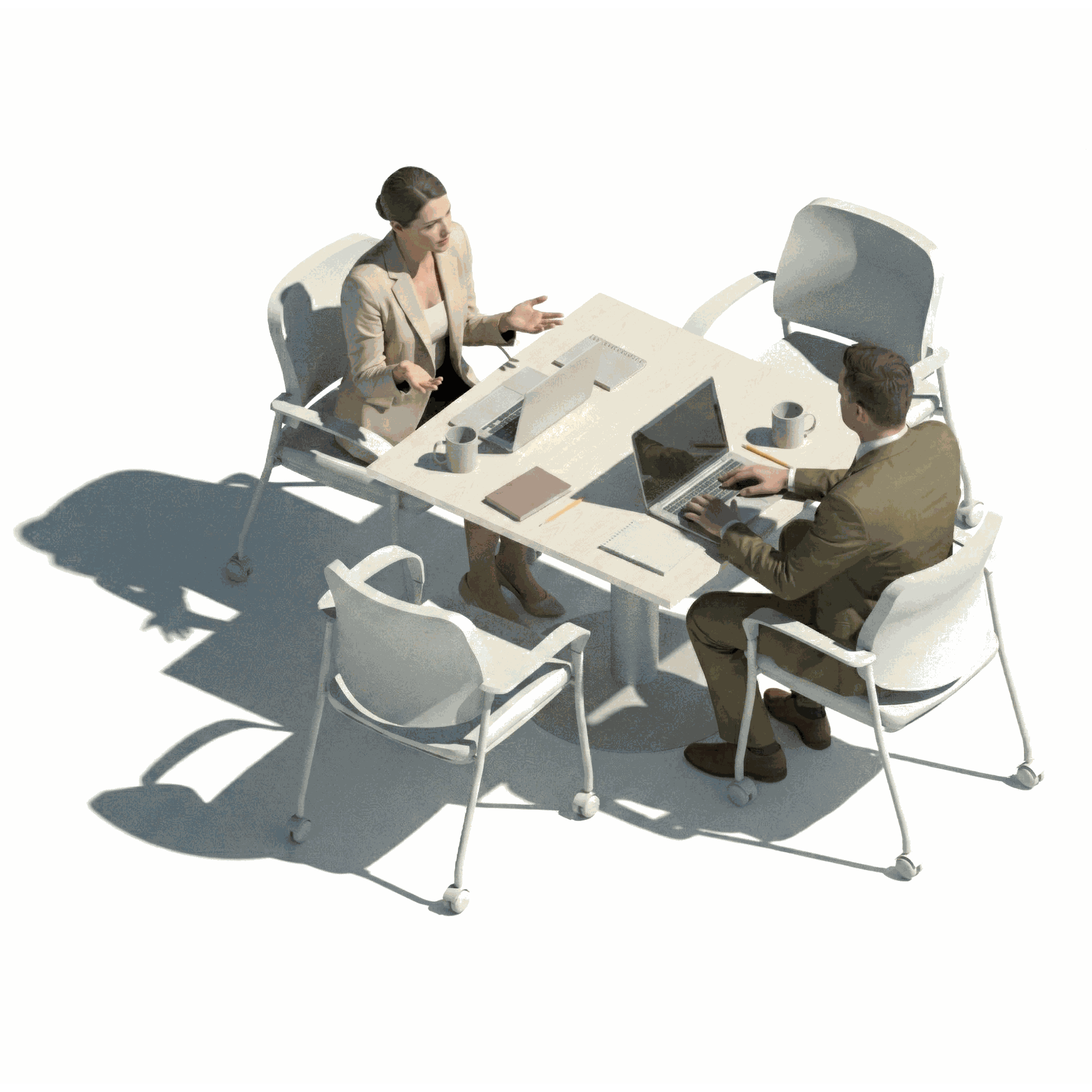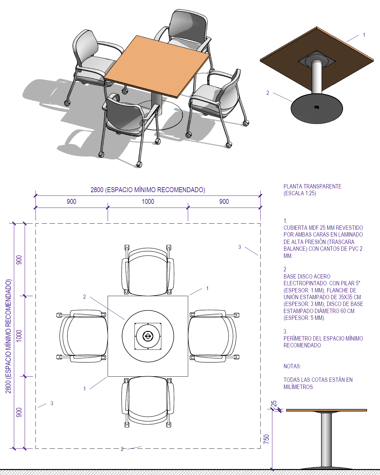 Cubierta fabricada con tablero MDF de 25 mm de espesor, revestido por ambas caras en laminado de alta presión (trascara color "Balance") y cantos rectos de PVC 2 mm de espesor. Pedestal de acero electropintado con disco de 60 cm (colores alternativos). Color del laminado de la cara superior alternativos en cualquiera de los siete muestrarios de laminado disponibles (muestrarios laminado de ancho 122 y 153 cm). Soporte de electrificación opcional.