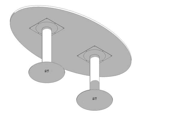 2. Pedestal acero electropintado con pilar 5" (espesor 1 mm); flanche de unión estampado de 35 x 35 cm (espesor 3 mm); disco de base diámetro 50 cm (espesor 5 mm).