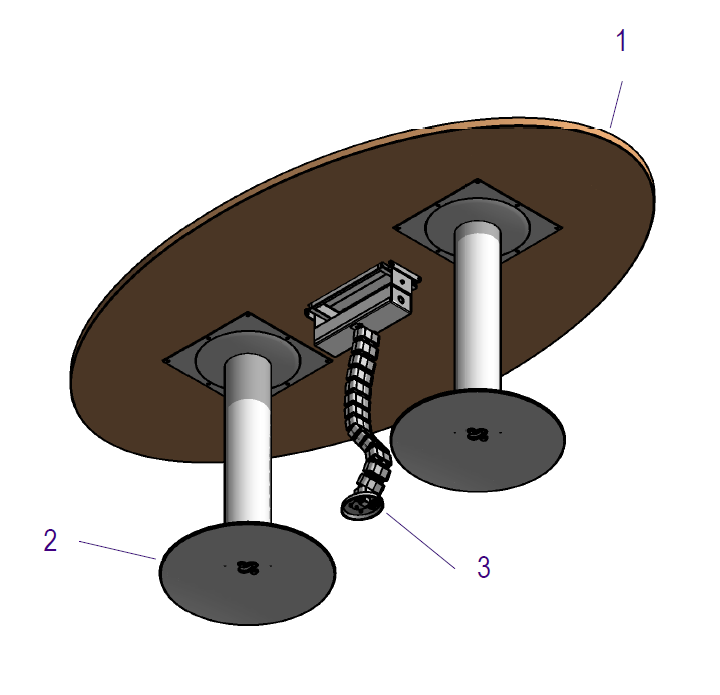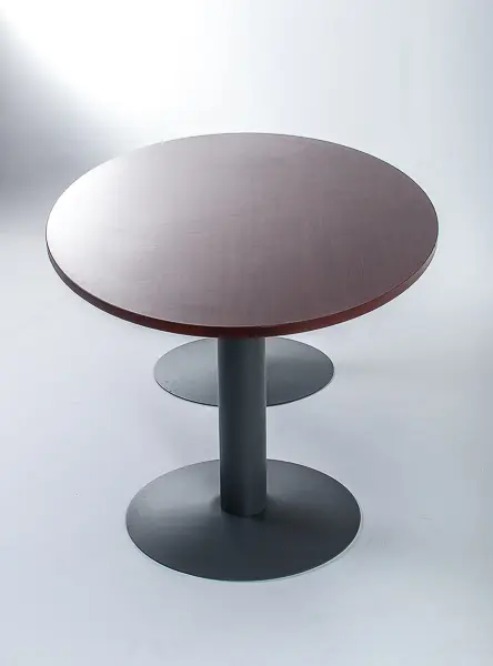 Cubierta fabricada con tablero MDF de 25 mm de espesor, revestido por ambas caras en laminado de alta presión (trascara color "Balance") y cantos rectos de PVC 2 mm de espesor. Pedestales de acero electropintado con disco de 50 cm (colores alternativos). Color del laminado de la cara superior alternativos en cualquiera de los siete muestrarios de laminado disponibles (muestrarios laminado de ancho 122 y 153 cm). Soporte de electrificación opcional.