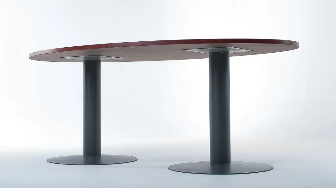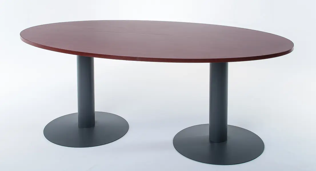 Mesa de reuniones electrificable con estructura Base Disco para 6 personas. Cubierta elíptica de 25 mm laminada, de 240 x 95 cm, en una pieza. Pedestales disco.