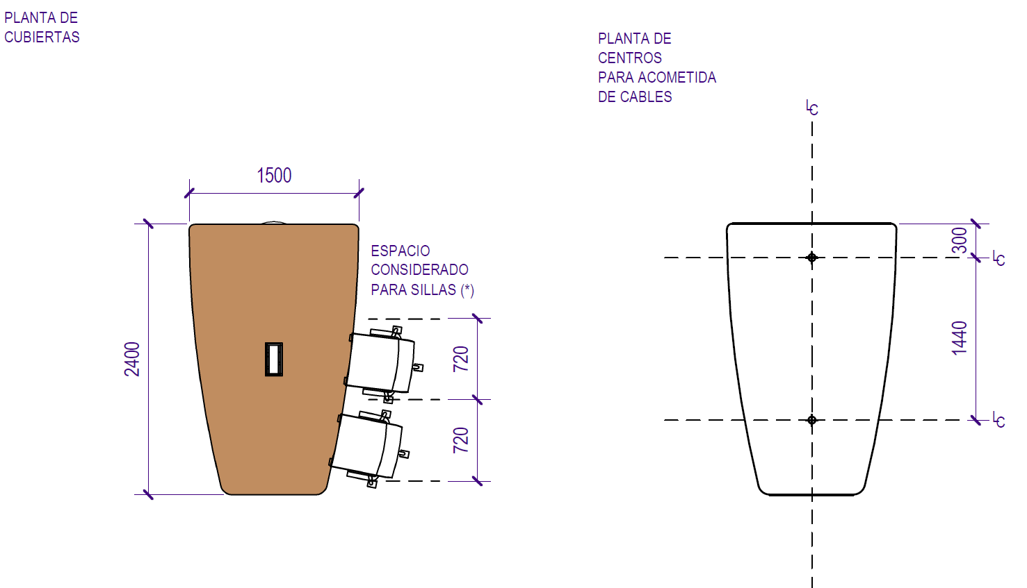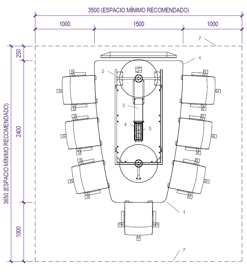 Dimensiones de cubierta y espacio considerado para sillas. Debe considerarse una holgura suficiente entre las sillas. Si se quiere usar sillas anchas o sillones tipo directorio debe replantearse el tamaño de la cubierta.