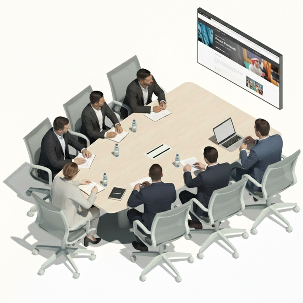 Mesa de reuniones electrificable con estructura Base Disco para 7 personas, adosable para monitor en la cabecera. Cubierta curva de 25 mm laminada, de 240 x 150 cm, en 1 pieza. Estructura base disco.
