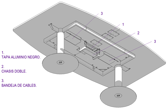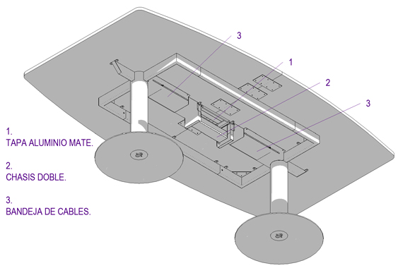 2. Sistema estructural con pedestales con base disco y bastidor superior. Acero electropintado.