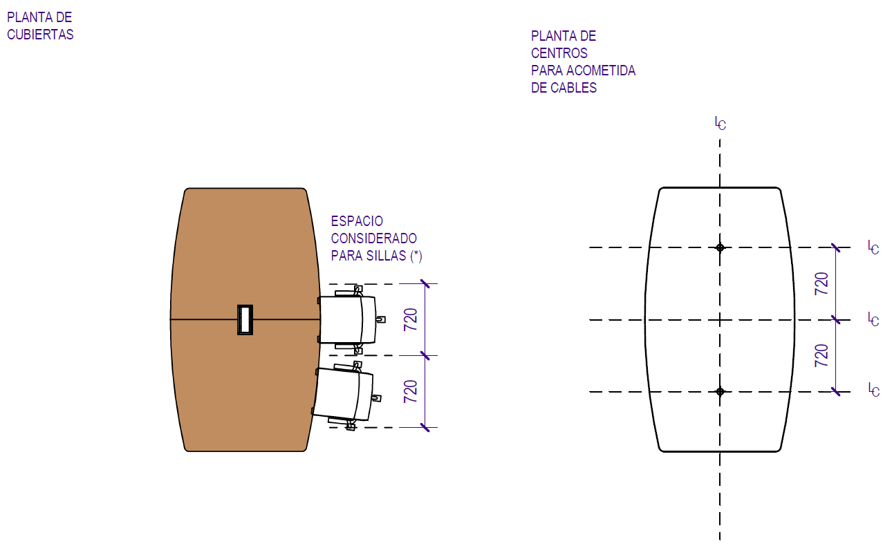 Dimensiones de cubierta y espacio considerado para sillas. Debe considerarse una holgura suficiente entre las sillas. Si se quiere usar sillas anchas o sillones tipo directorio debe replantearse el tamaño de la cubierta.
