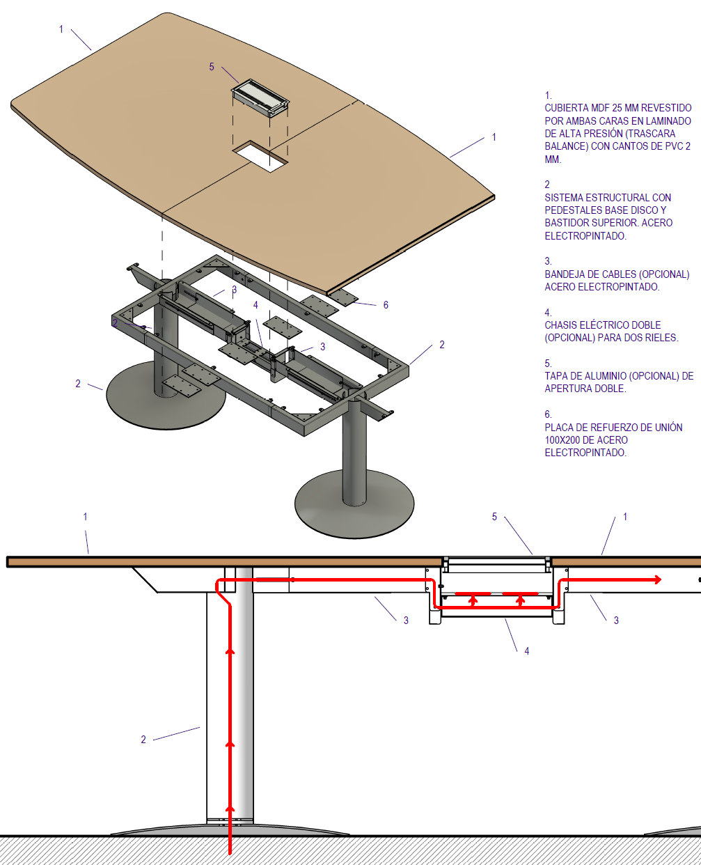 Cubiertas fabricadas con tablero MDF de 25 mm de espesor, revestido por ambas caras en laminado de alta presión (trascara color "Balance") y cantos rectos de PVC 2 mm de espesor. Estructura en acero electropintado con pedestales con base disco (colores alternativos). Color del laminado de la cara superior alternativos en cualquiera de los tres muestrarios de laminado disponibles (muestrarios laminado de ancho 153 cm). Soporte de electrificación opcional.