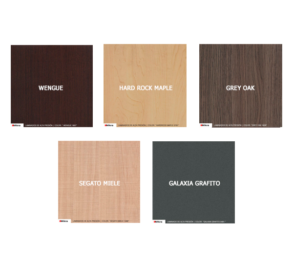 1. Cubierta MDF 25 mm revestido por ambas caras en laminado de alta presión (trascara Balance) con cantos rectos de PVC de 2 mm de espesor.