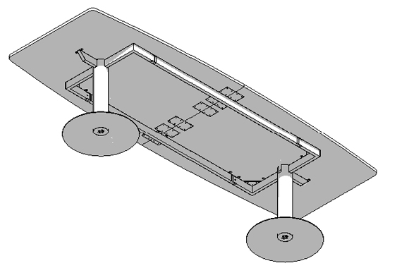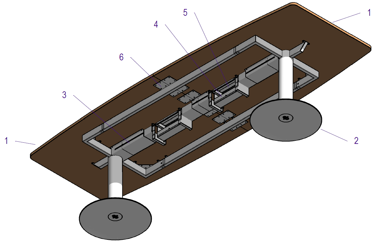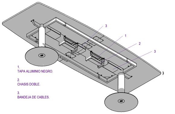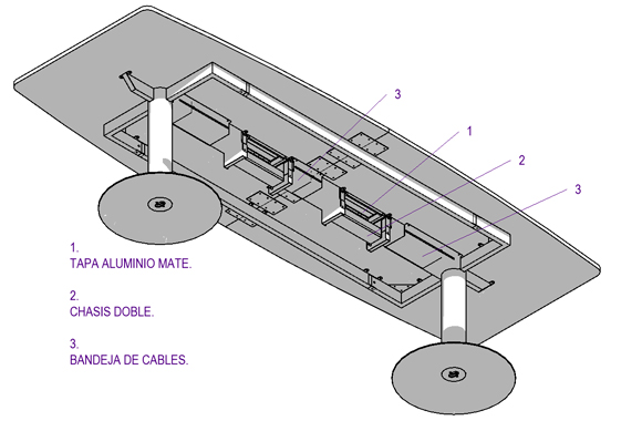 2. Sistema estructural con pedestales con base disco y bastidor superior. Acero electropintado.