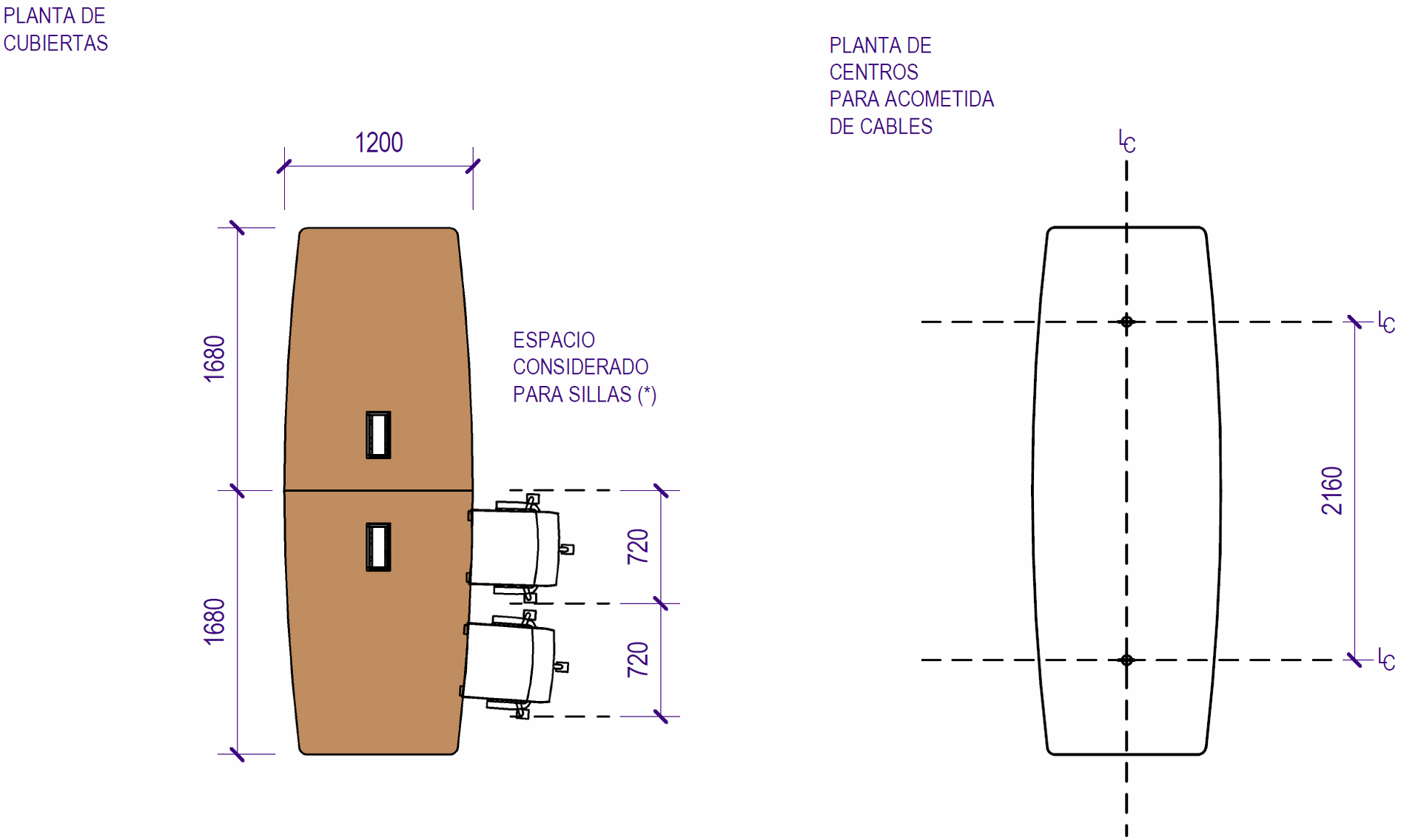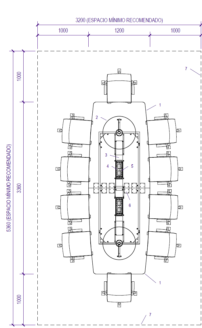 Dimensiones de cubierta y espacio considerado para sillas. Debe considerarse una holgura suficiente entre las sillas. Si se quiere usar sillas anchas o sillones tipo directorio debe replantearse el tamaño de la cubierta.