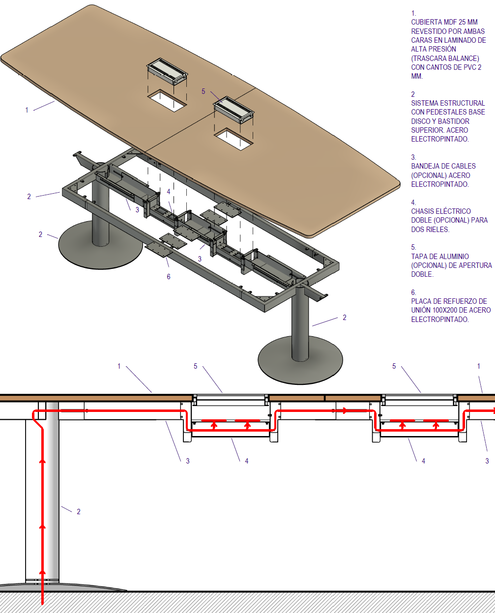 Cubierta fabricada con tablero MDF de 25 mm de espesor, revestido por ambas caras en laminado de alta presión (trascara color "Balance") y cantos rectos de PVC 2 mm de espesor.Estructura en acero electropintado con pedestales con base disco (colores alternativos). Color del laminado de la cara superior alternativos en cualquiera de los siete muestrarios de laminado disponibles (muestrarios laminado de ancho 122 y 153 cm). Soporte de electrificación opcional.