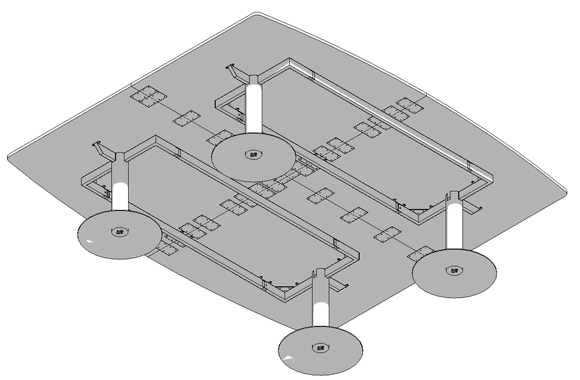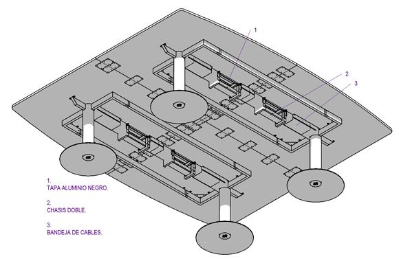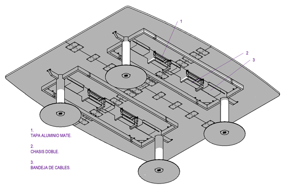 2. Sistema estructural con pedestales con base disco y bastidor superior. Acero electropintado.