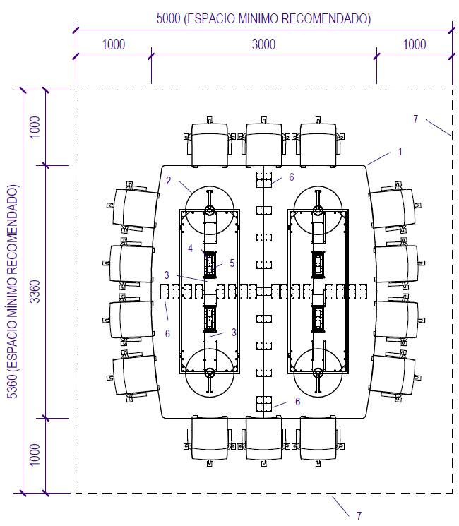 Componentes y espacio mínimo recomendado para las dimensiones de la mesa.