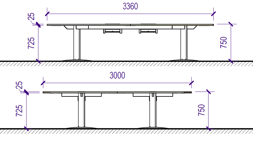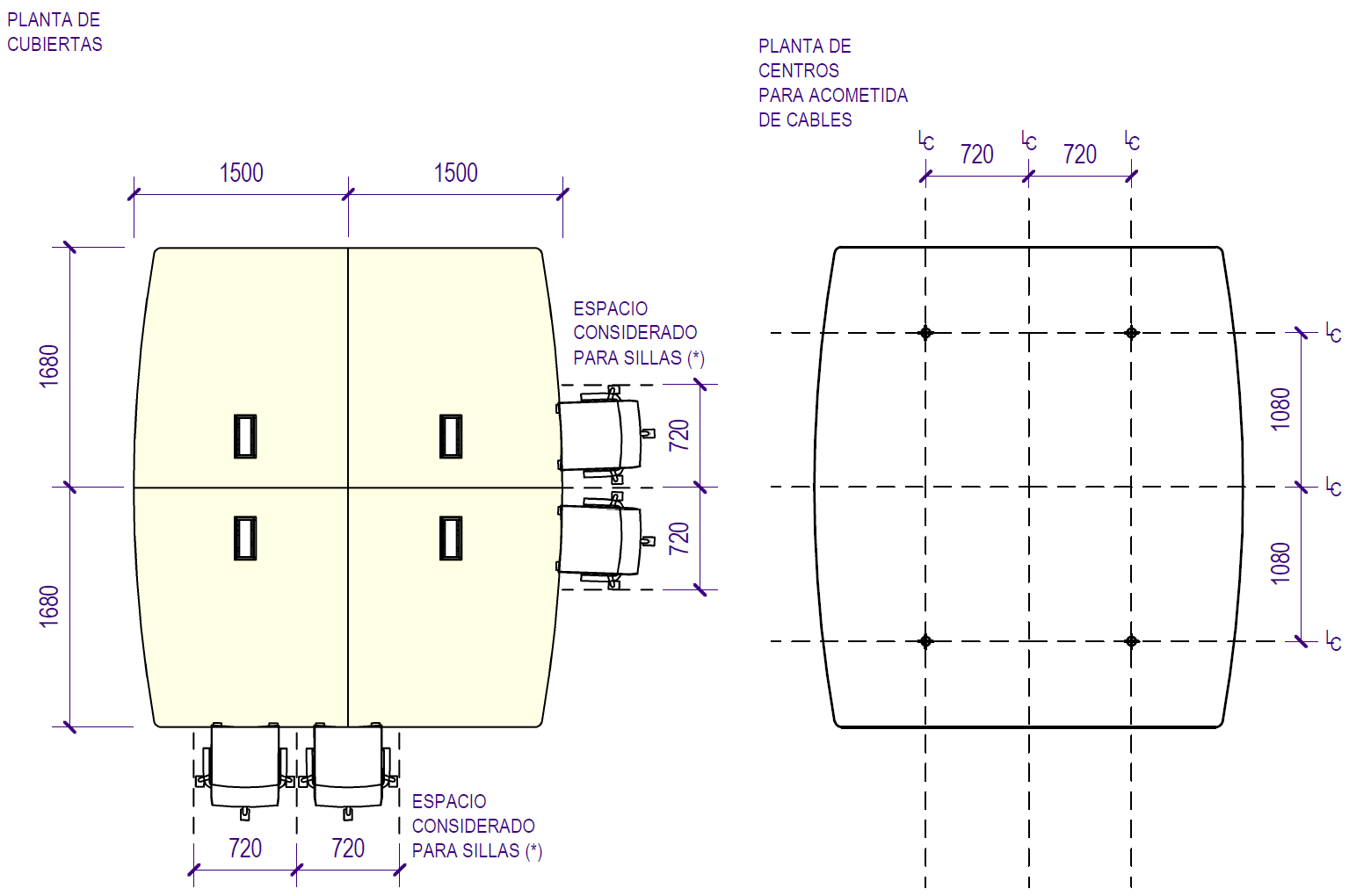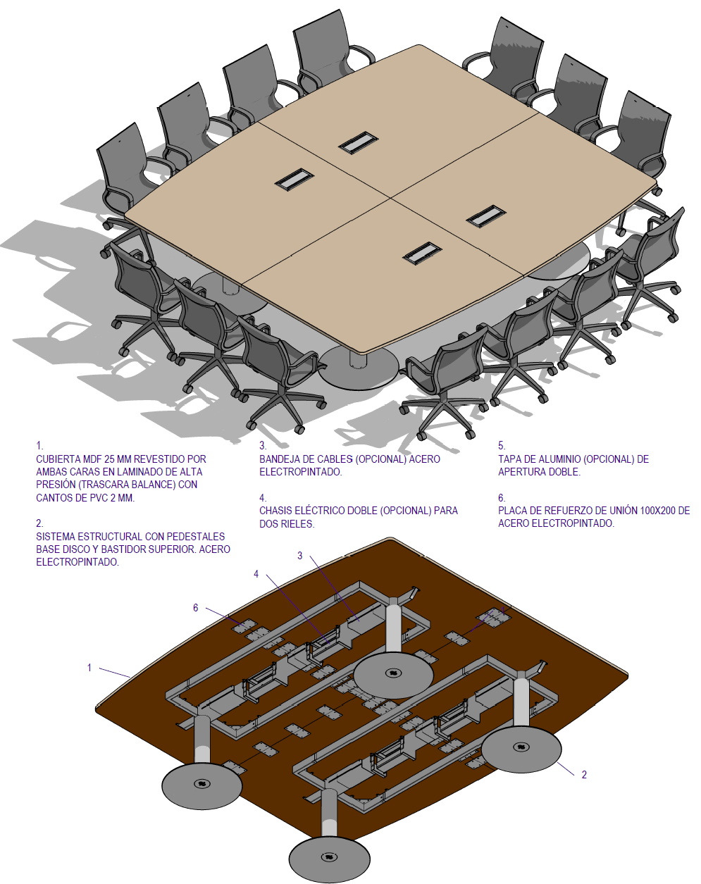 Cubiertas fabricadas con tablero MDF de 25 mm de espesor, revestido por ambas caras en laminado de alta presión (trascara color "Balance") y cantos rectos de PVC 2 mm de espesor. Estructura en acero electropintado con pedestales con base disco (colores alternativos). Color del laminado de la cara superior alternativos en cualquiera de los tres muestrarios de laminado disponibles (muestrarios laminado de ancho 153 cm). Soporte de electrificación opcional.