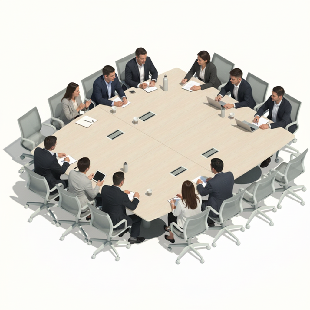 Mesa de reuniones electrificable con estructura Base Disco para 14 personas. Cubierta curva de 25 mm laminada, de 336 x 300 cm, en 4 secciones. Estructura base disco.